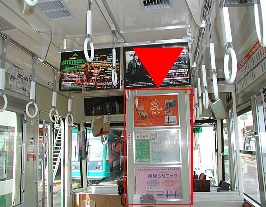 | 単位 | 部分ラッピング、中吊ポスター20枚、 正面額4枚 側面吊ポスター4枚、 内側20〜25枚、 (単車1両分) 1ヵ月 部分ラッピング、中吊ポスター40枚、 正面額4枚 側面吊ポスター8枚、 内側35〜50枚、 (連接車1編成分) 1ヵ月 |
