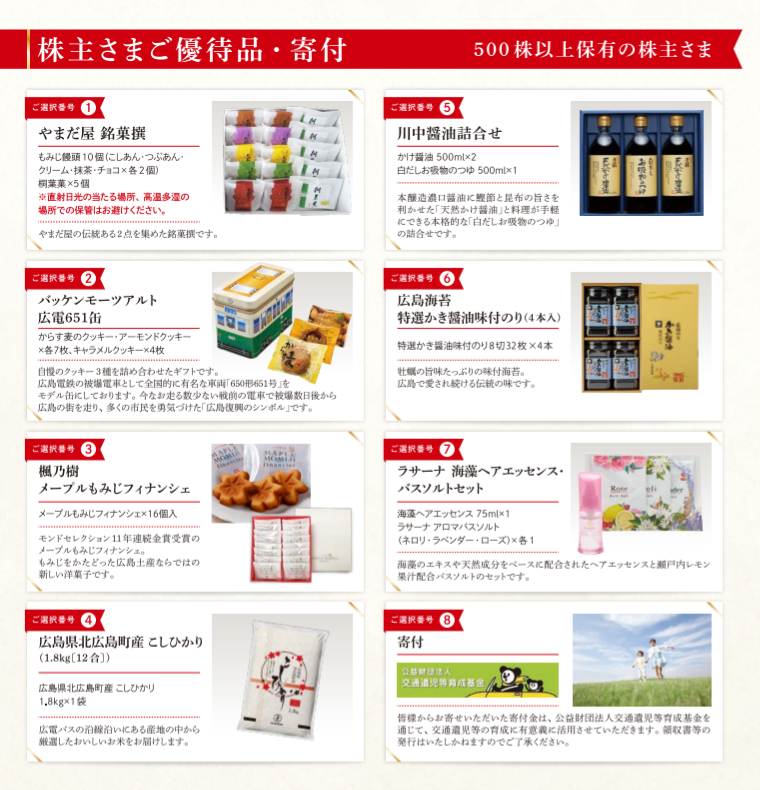 毎年3月31日および9月30日の最終の株主名簿および実質株主名簿に記載または記録された株主様に対して、その所有株式数に応じて次のとおり株主優待回数乗車券・乗車証および広電グループ諸施設株主ご優待割引券および株主優待選択商品をお渡しいたします。