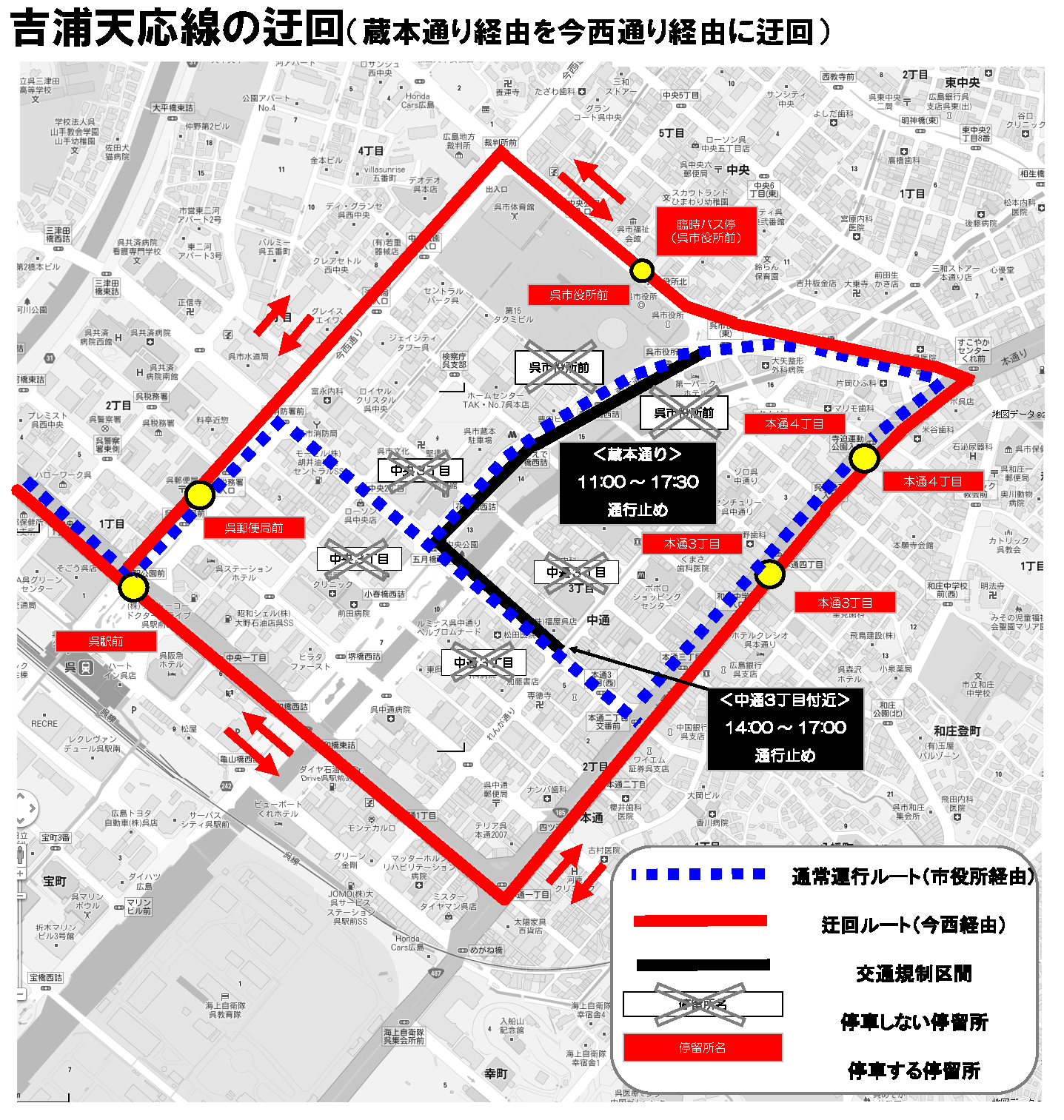 | 34吉浦天応線 | 天応福浦 8:03発 ~ 17:12発 | 「蔵本通り経由」を「今西通り経由」に迂回します。 ※「呉市役所前」臨時停留所を設置して運行します。 |