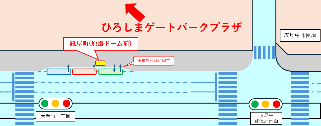 「原爆ドーム前」(八丁堀方面)および「紙屋町(メルパルク前)」を「紙屋町(ひろしまゲートパークプラザ前)」へ統合