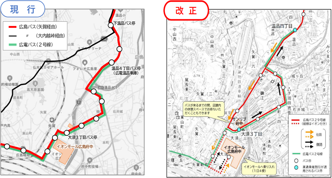 - 9時台~16時台の広島バス29号線(矢賀経由)の運行区間を「小河原車庫~大須三丁目およびイオンモール広島府中」にフィーダー化し、増便します。