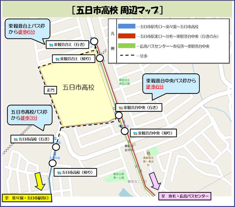- 五日市駅南口発着便をご利用の方は「五日市高校バス停」をご利用ください。